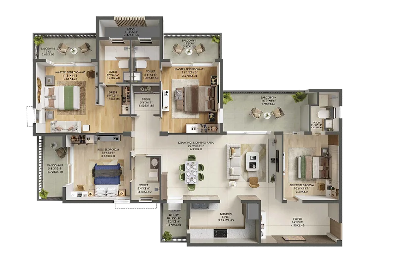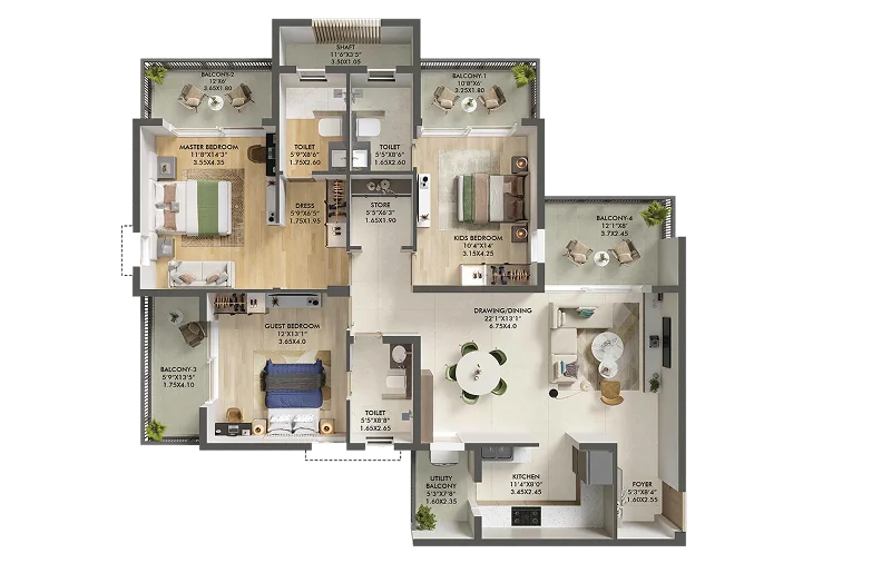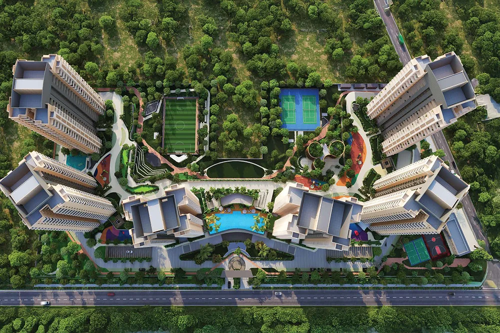 Ashiana Aaroham in Sector 80, Gurugram, is a premium luxury residential community spread across a sprawling 10.08 acres. Designed to offer an elevated lifestyle, the project features beautifully crafted 3, 4 & 5 BHK & Town Houses, each with a spacious private deck and panoramic views of lush green surroundings — delivering the perfect balance of elegance and tranquility. With just 6 towers, Ashiana Aaroham ensures exclusivity and a low-density living experience. Residents enjoy a peaceful, pedestrian-friendly environment with 93% open area and zero vehicular movement on the ground floor. Of the total land parcel, 9.02 acres are thoughtfully dedicated to open and green spaces, promoting a refreshing, sustainable, and community-focused lifestyle.